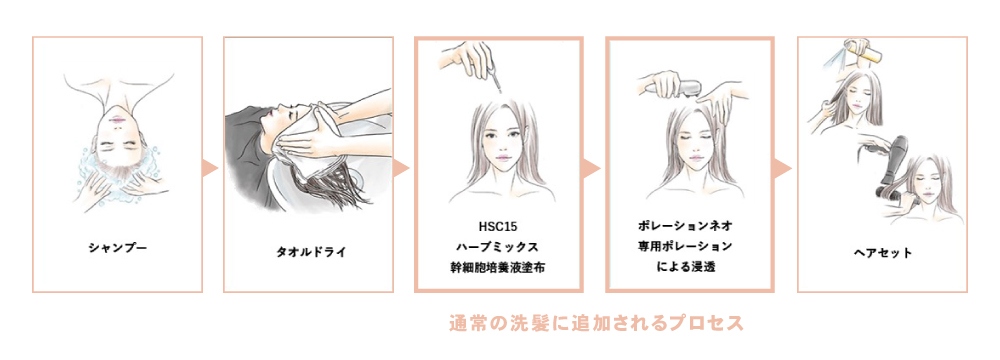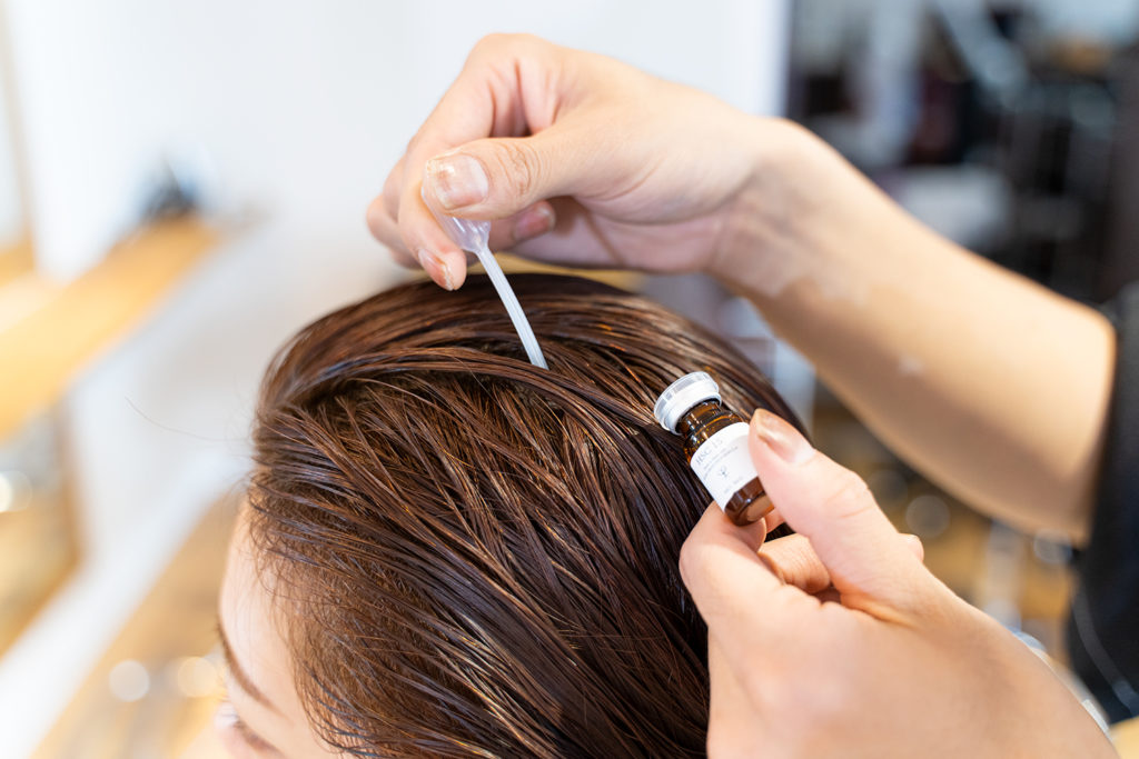 強髪プログラムは、洗髪・ブロー後にヒト幹細胞培養液を頭皮に塗布。