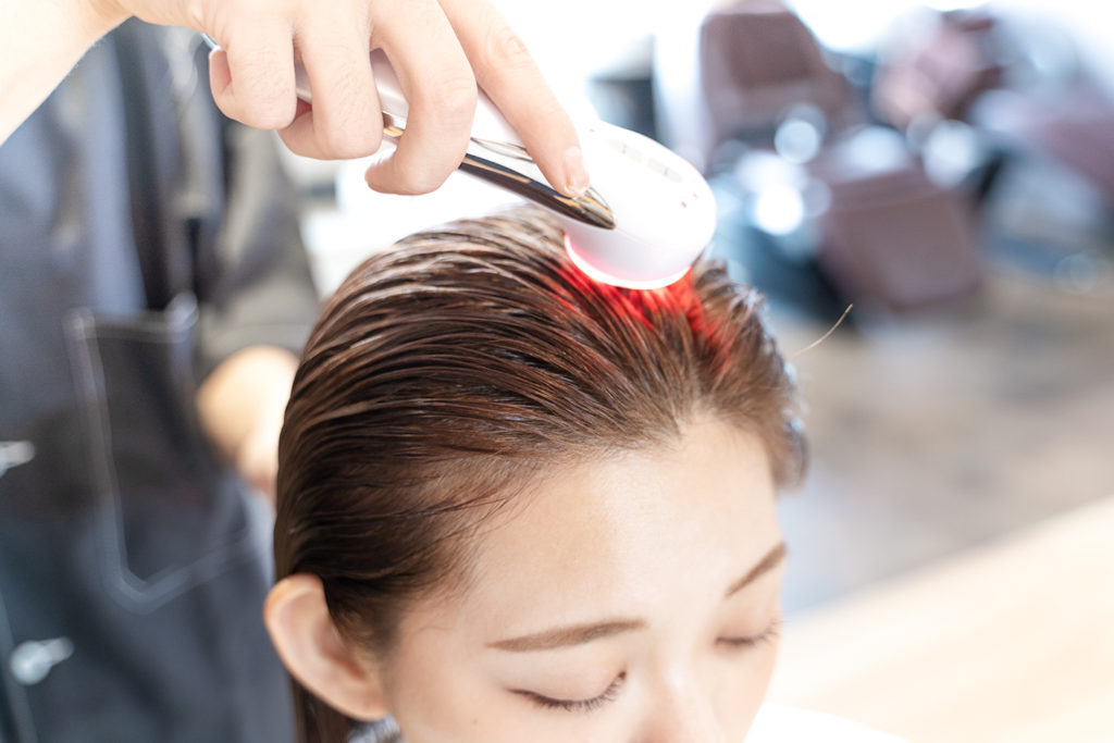 強髪プログラムは、洗髪・ブロー後にヒト幹細胞培養液を頭皮に塗布。皮膚表面に電磁パルスをかけるエレクトロポーレーションで育毛ケア!